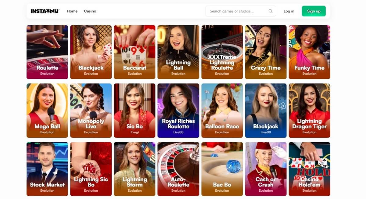 Click the' Live Casino' tab to play live dealer casino games at InstaSpin Casino. There, you will find a selection of exciting games available 24/7 from Evolution and Ezugi. You can enjoy classic casino games at the live tables such as Live Casino Holdem, Super Sic Bo, Lucky 7, Xtreme Lightning Roulette, Dragon Tiger, Bac Bo and Power Blackjack.